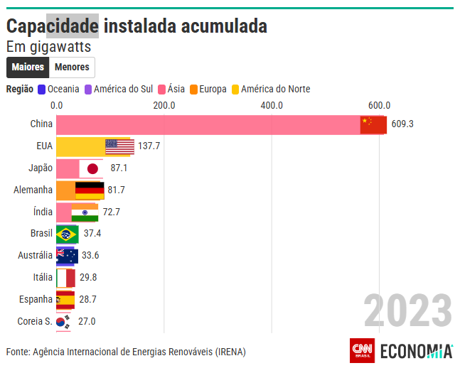 O Brasil alcançou a 6ª posição no ranking mundial de geração de energia solar, após subir duas posições em 2023. Segundo dados da Associação Brasileira de Energia Solar Fotovoltaica (Absolar), com base em informações da Agência Internacional de Energias Renováveis (Irena), o país encerrou o ano com mais de 37 gigawatts (GW) de capacidade operacional instalada. Apenas em 2023, foram adicionados quase 12 GW, colocando o Brasil na 4ª posição global quando se considera somente a potência anual adicionada.